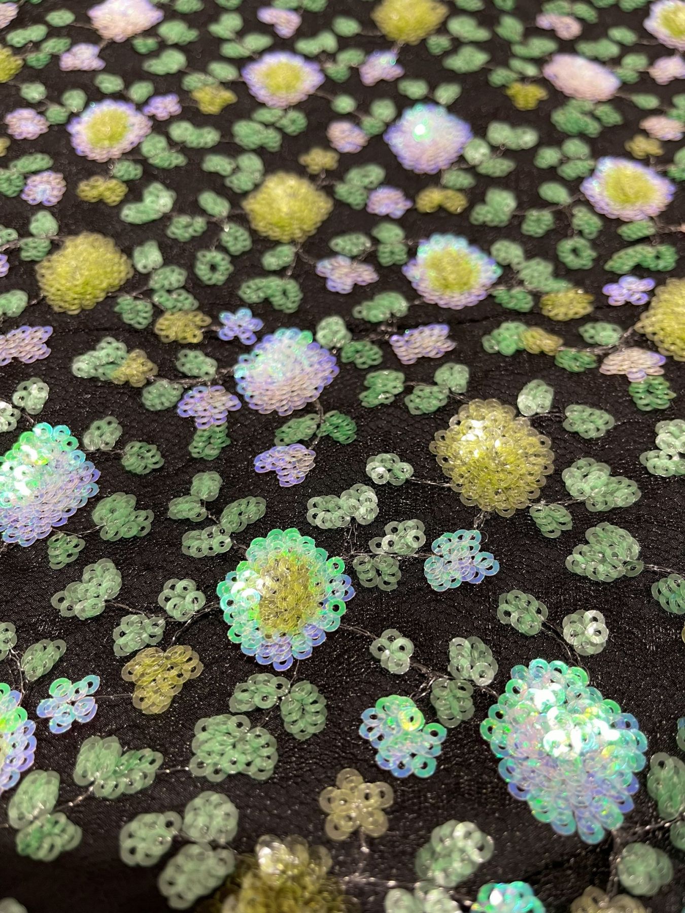 - Design: Black background with a small floral pattern and sequin details (green/yellow).