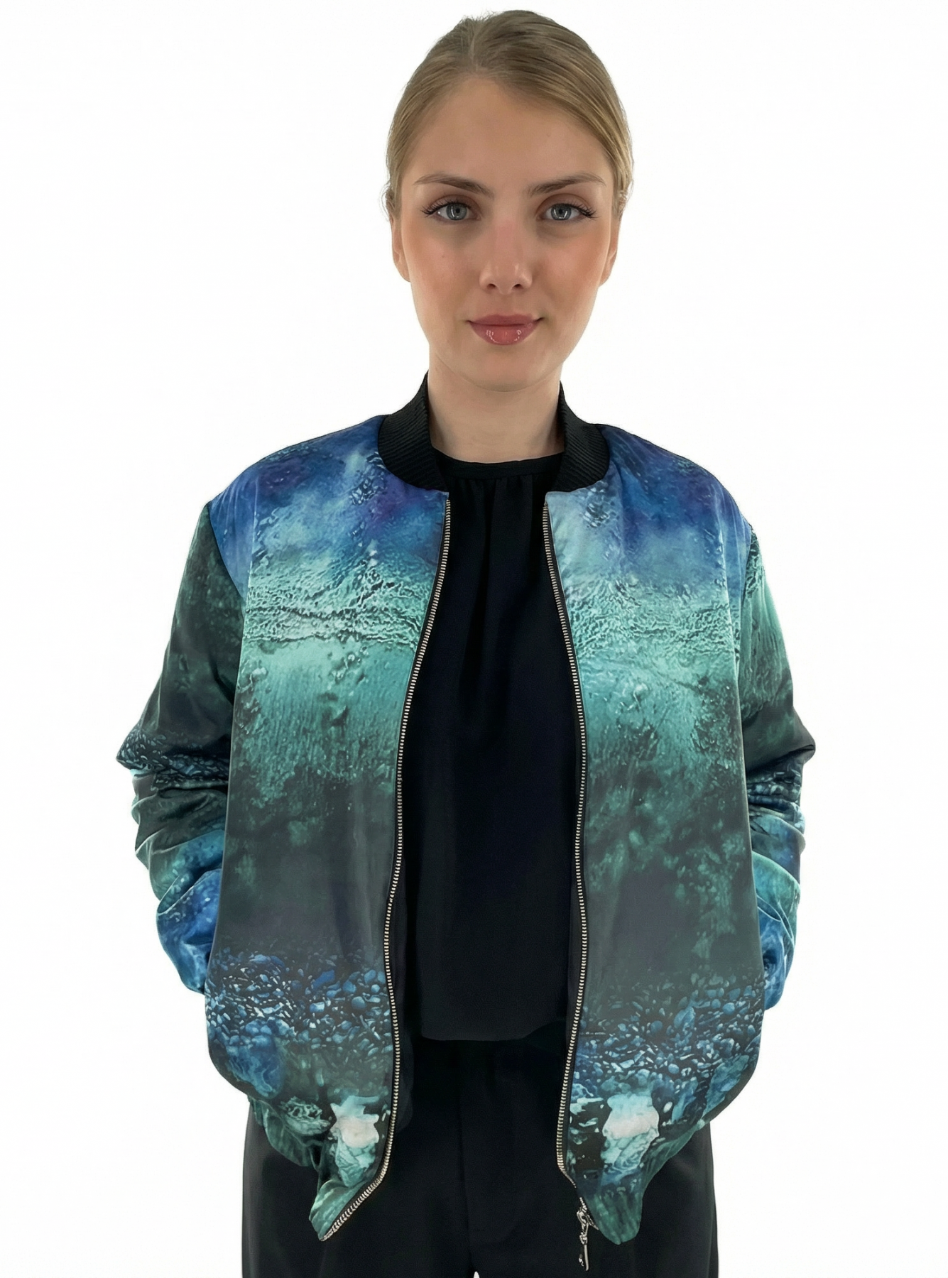 Diese außergewöhnliche Bomberjacke zieht mit ihrem faszinierenden Allover-Print sofort alle Blicke auf sich. Das abstrakte Muster in leuchtenden Türkis-, tiefen Blau- und dunklen Schwarztönen erinnert an geheimnisvolle Unterwasserwelten. Sie ist das perfekte Statement-Piece, um schlichte Outfits sofort aufzuwerten. Die Jacke überzeugt nicht nur durch ihr Design, sondern auch durch ihre hochwertige Ausstattung. Die glatte Oberfläche des Materials verleiht ihr einen edlen, modernen Touch. Dank des wattierten Futters bietet die Jacke angenehme Wärme und ist somit der ideale Begleiter für die Übergangszeit. Für den klassischen Blouson-Look sorgt der charakteristische schwarze Strickansatz am Kragen. Praktische Seitentaschen und eine Innentasche fügen sich dezent in das Design ein und bieten Platz für wichtige Kleinigkeiten oder wärmen Ihre Hände.