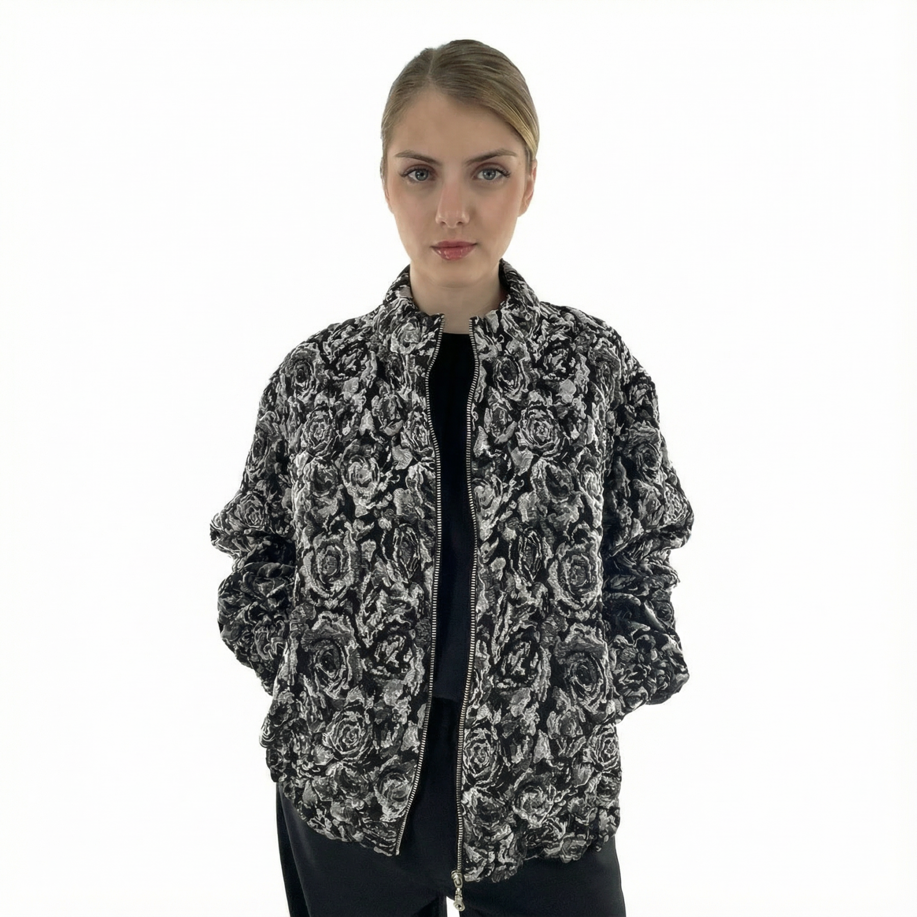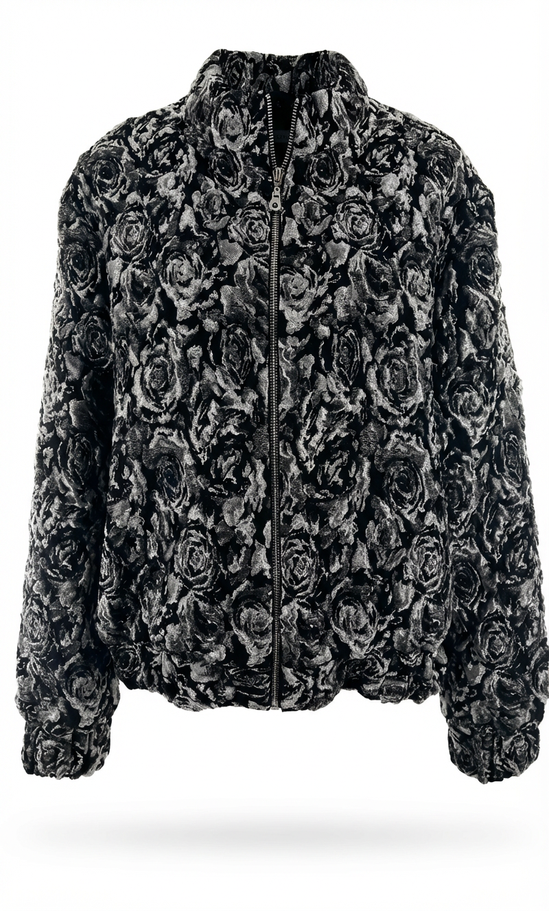 Diese Bomberjacke aus edlem Brokatstoff überzeugt durch sein ausdrucksstarkes 3D-Effekt-Blumenmuster in Schwarz-Silber, das dem Design Tiefe und einen luxuriösen Charakter verleiht. Die feine Struktur des Brokats sorgt für eine moderne, zugleich elegante Optik. Ein 2-Wege-Metallreißverschluss und Taschen setzten einen stilvollen Akzent und bieten zusätzlich bequeme Tragemöglichkeiten – funktional und dekorativ zugleich.