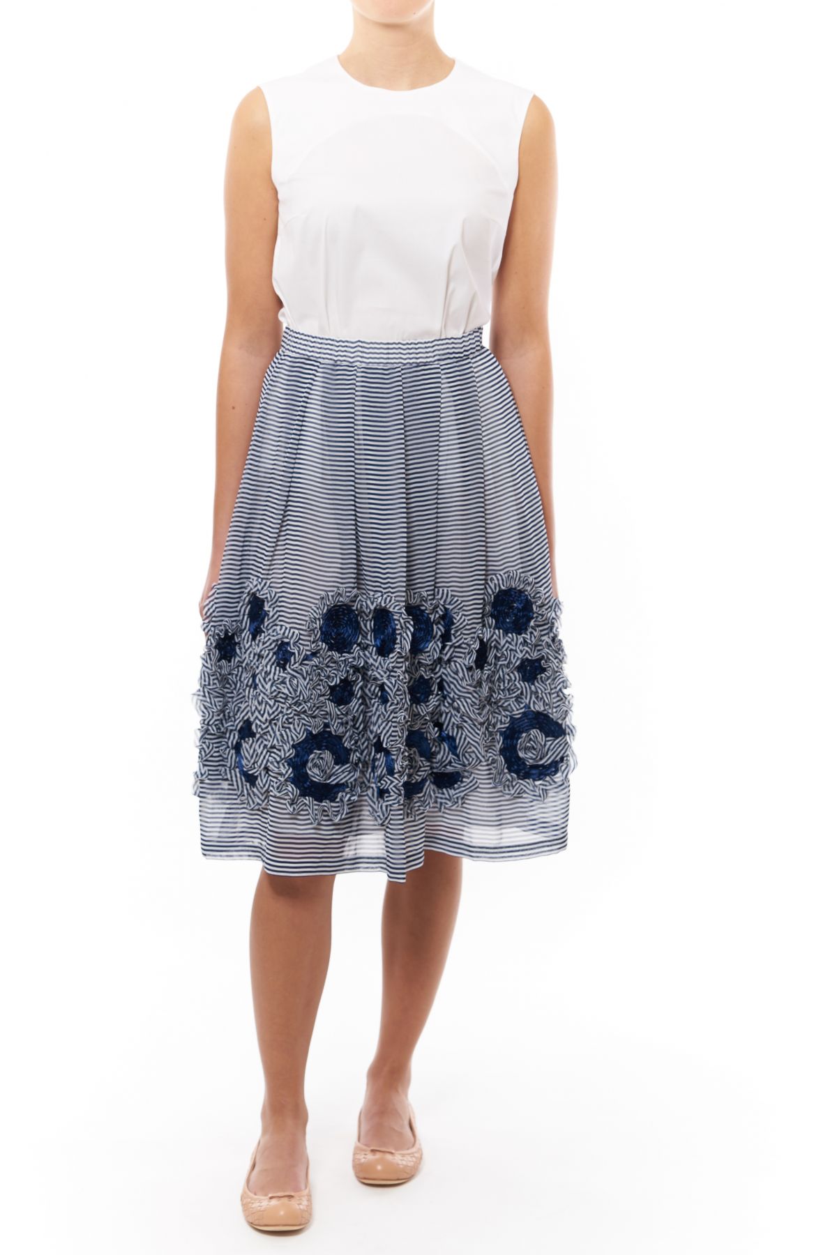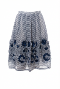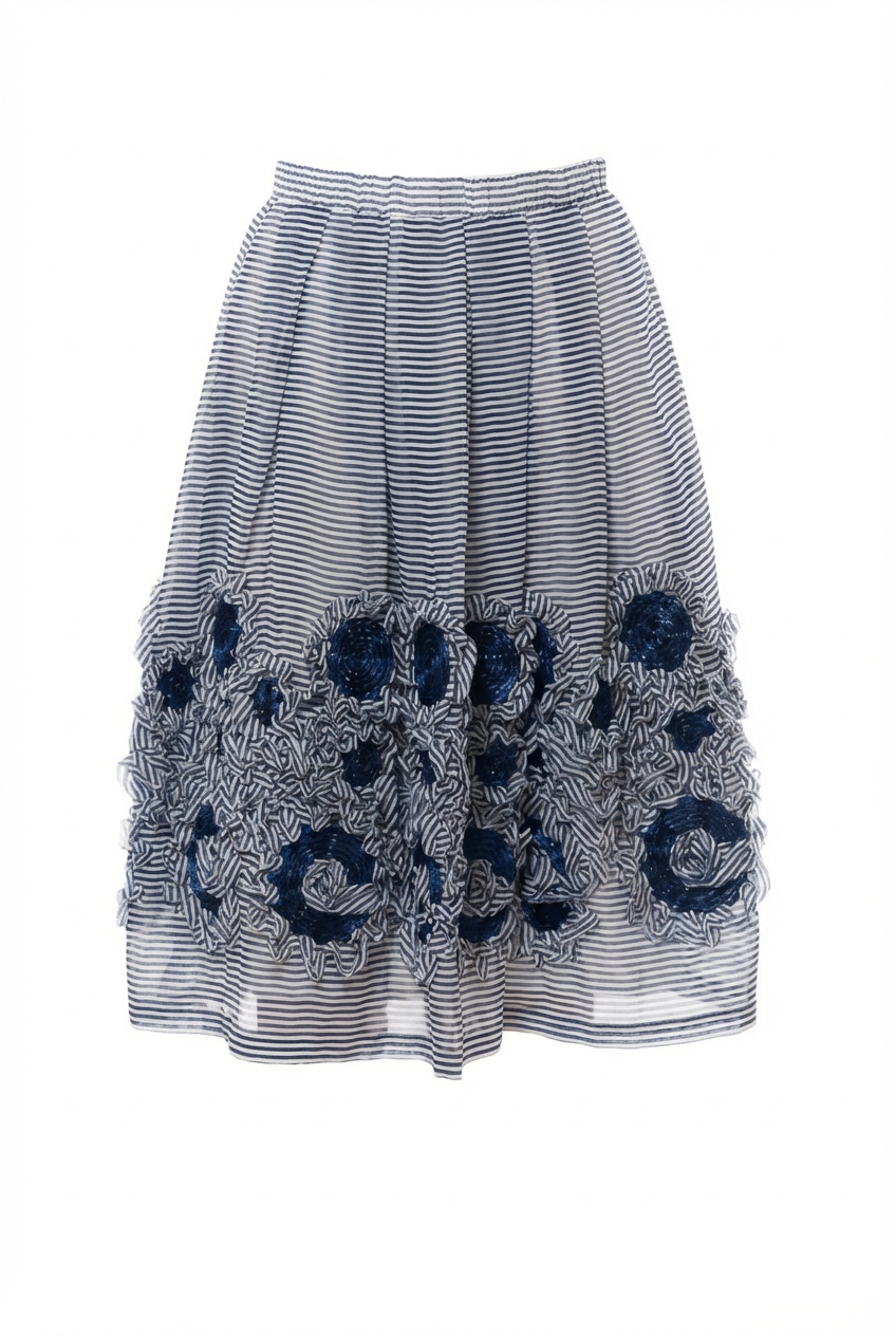 Der leichte, fließende schmeichelt der Figur und sorgt für ein angenehmes Tragegefühl, das besonders an warmen Sommertagen perfekt ist. Das Design zeigt zarte, weiße und blaue Streifen, die dem Rock eine frische und maritime Ausstrahlung verleihen. Hinzu kommen feine Blumenmuster, die durch einen dezenten 3D-Effekt lebendig wirken und dem Rock eine einzigartige Tiefe verleihen. Der lockere Schnitt sorgt für Luftigkeit und Bewegungsfreiheit, während der fließende Stoff die Silhouette elegant umspielt. Ob am Strand, bei einem Spaziergang in der Stadt oder einem sommerlichen Brunch – dieser Rock bringt den perfekten Hauch von Frische und Stil in deinen Look.
