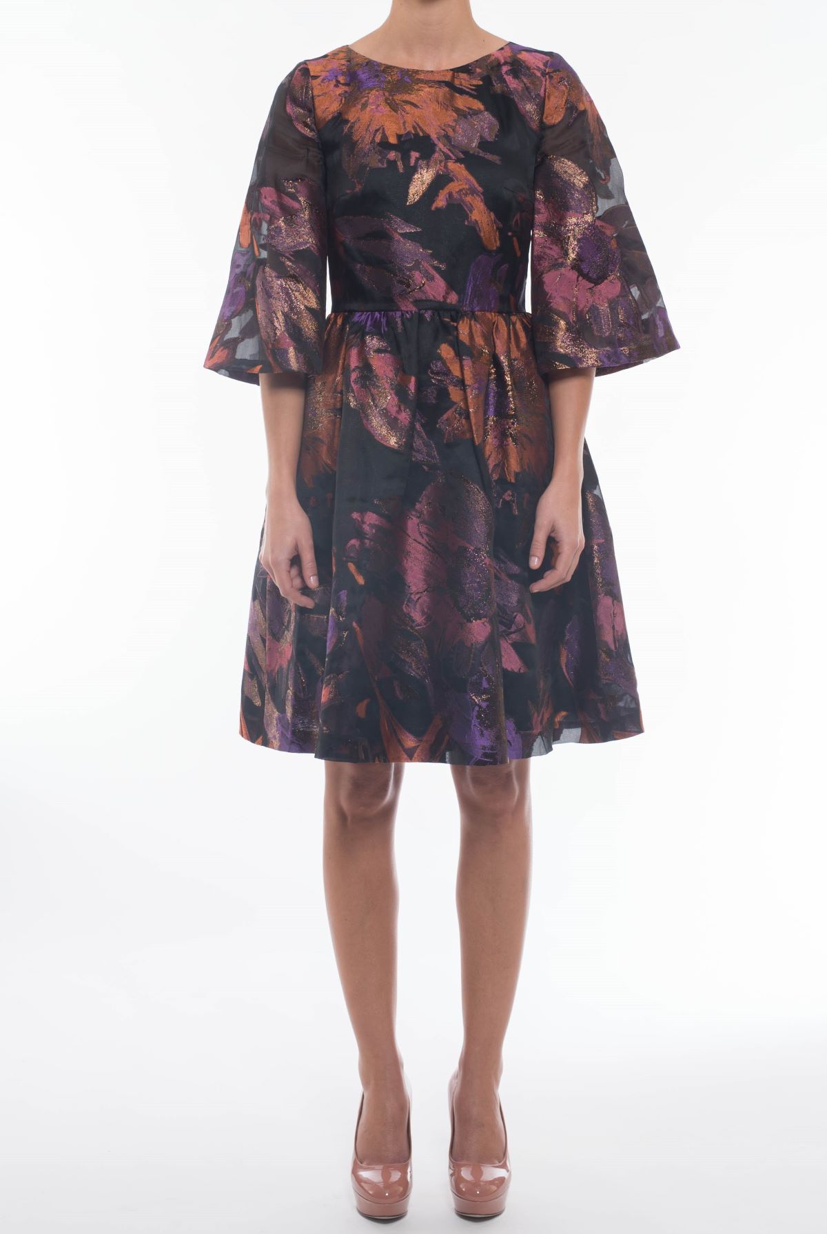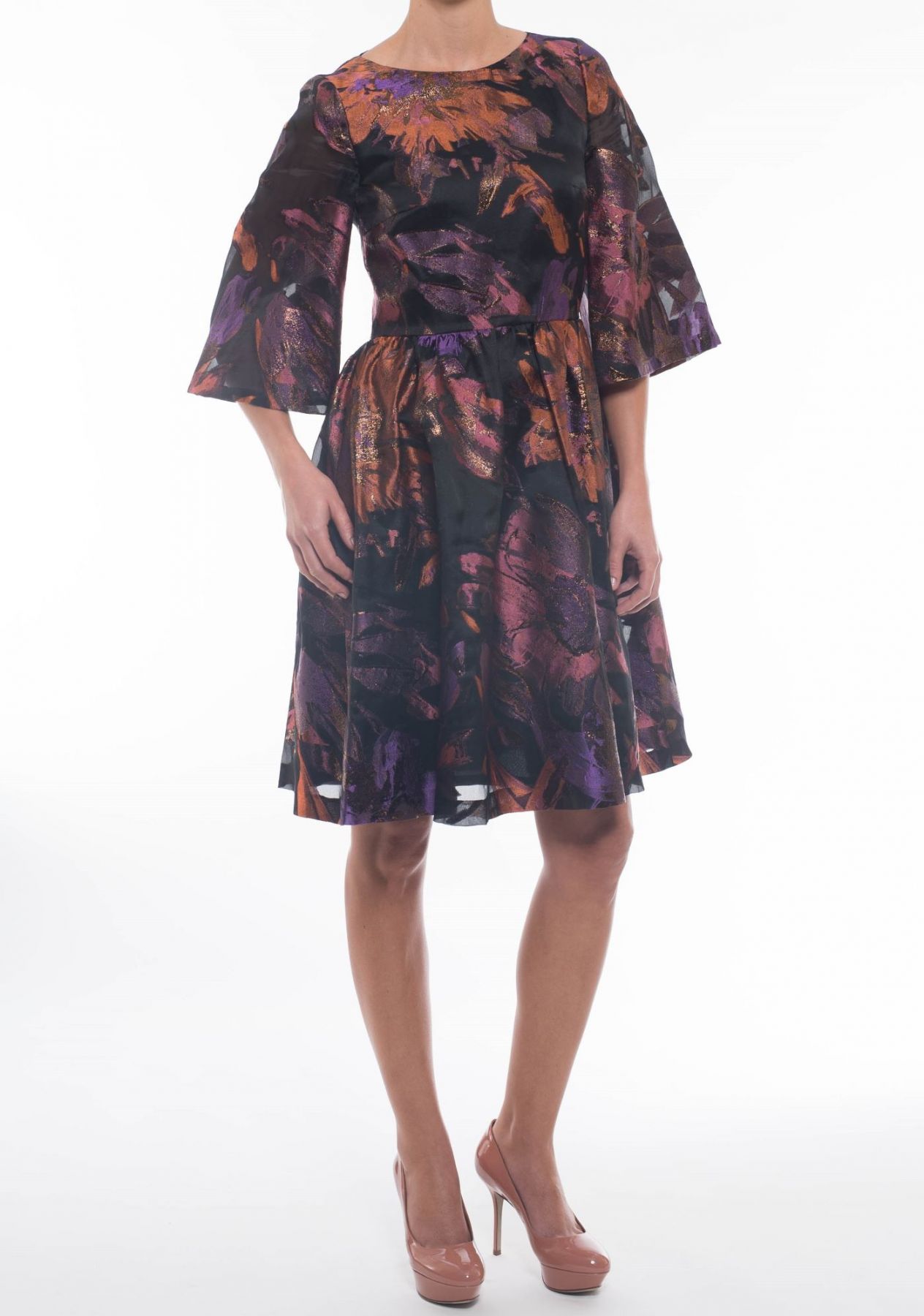 Dieses Kleid definiert Eleganz durch sein außergewöhnliches Material. Gefertigt aus einem exklusiven französischen Stoff, zieht das kunstvolle, kupferfarbene Dessin auf dunklem Fond alle Blicke auf sich. Der hohe Seidenanteil von 43% verleiht dem Kleid einen edlen, subtilen Schimmer und eine luxuriöse Haptik. Der Schnitt unterstreicht eine feminine Silhouette: Ein klassischer Rundhalsausschnitt und modische 3/4-Trompetenärmel werden durch eine betonte Taille ergänzt. Der ausgestellte Rockteil fällt schwungvoll in A-Linie und endet elegant auf Kniehöhe. Für einen perfekten Sitz sorgt das separate Futterkleid, während ein Reißverschluss am Rücken das An- und Ausziehen erleichtert. Ein zeitloses Statement-Piece für gehobene Anlässe.