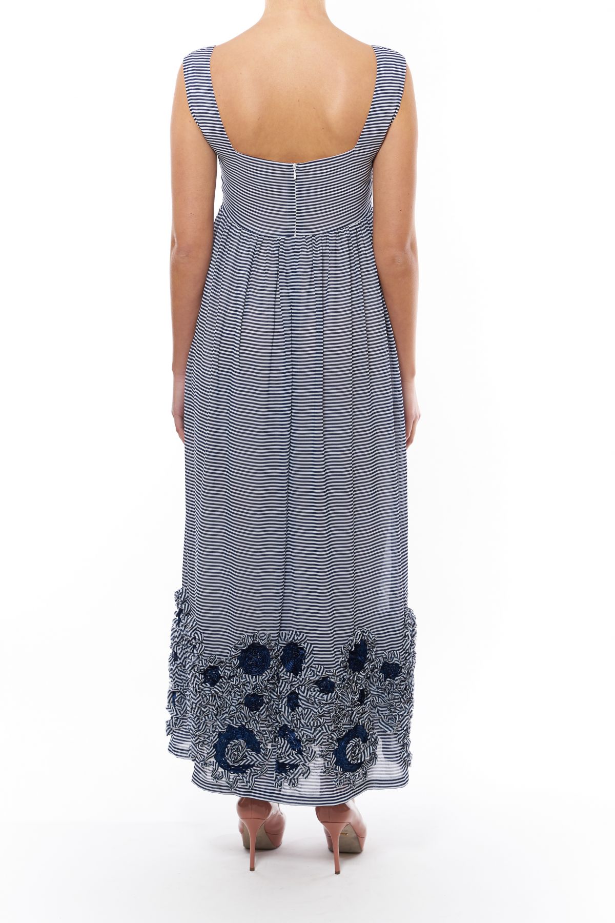 Dieses elegante Kleid kombiniert klassischen Marine-Look mit einem modernen Twist. Der leichte, fließende schmeichelt der Figur und sorgt für ein angenehmes Tragegefühl, das besonders an warmen Sommertagen perfekt ist. Das Design zeigt zarte, weiße und blaue Streifen, die dem Kleid eine frische und maritime Ausstrahlung verleihen. Hinzu kommen feine Blumenmuster, die durch einen dezenten 3D-Effekt lebendig wirken und dem Kleid eine einzigartige Tiefe verleihen. Der lockere Schnitt sorgt für Luftigkeit und Bewegungsfreiheit, während der fließende Stoff die Silhouette elegant umspielt. Ob am Strand, bei einem Spaziergang in der Stadt oder einem sommerlichen Brunch – dieses Kleid bringt den perfekten Hauch von Frische und Stil in deinen Look.